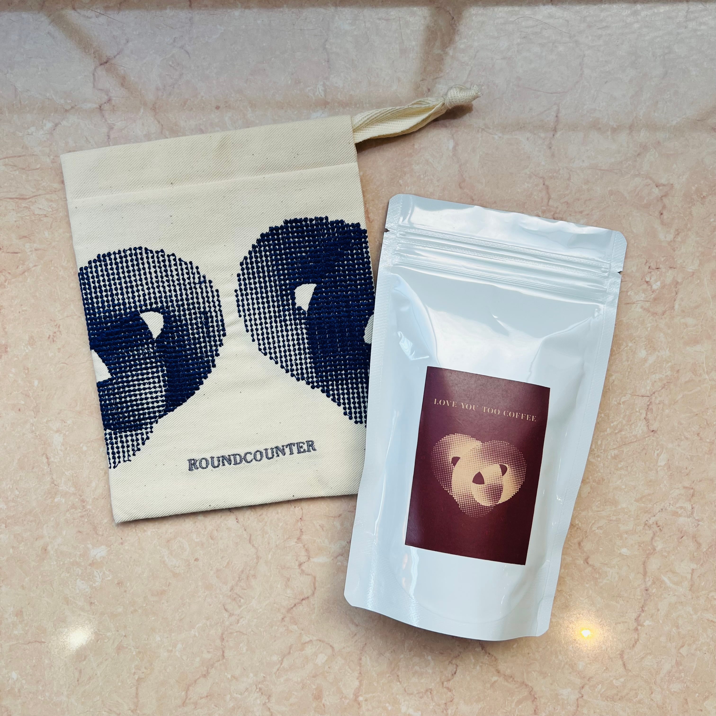アーティスト TAKERU による刺繍巾着と、コーヒー豆をセットにしました。